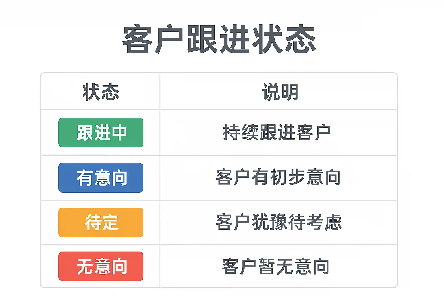 为了便于实际操作和标准化管理,不同行业和企业可根据自身需求设定多层次的客户跟进状态。以下为典型分级示例: