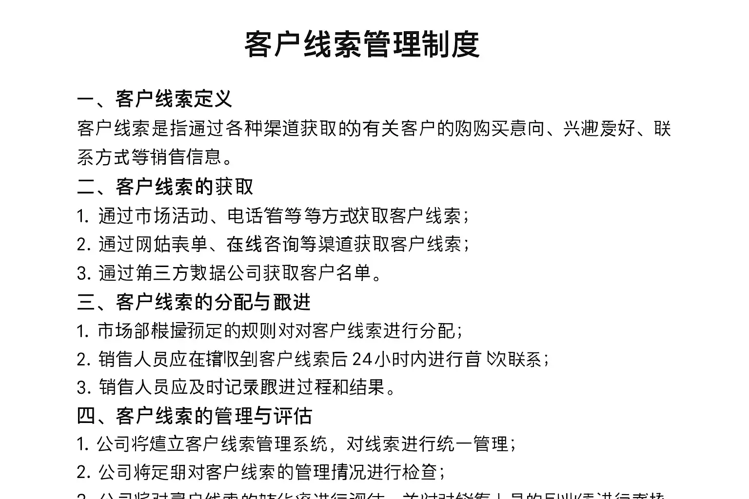为实现高效的客户开发与维护,企业需建立标准化的客户线索管理制度。其主要内容包括: