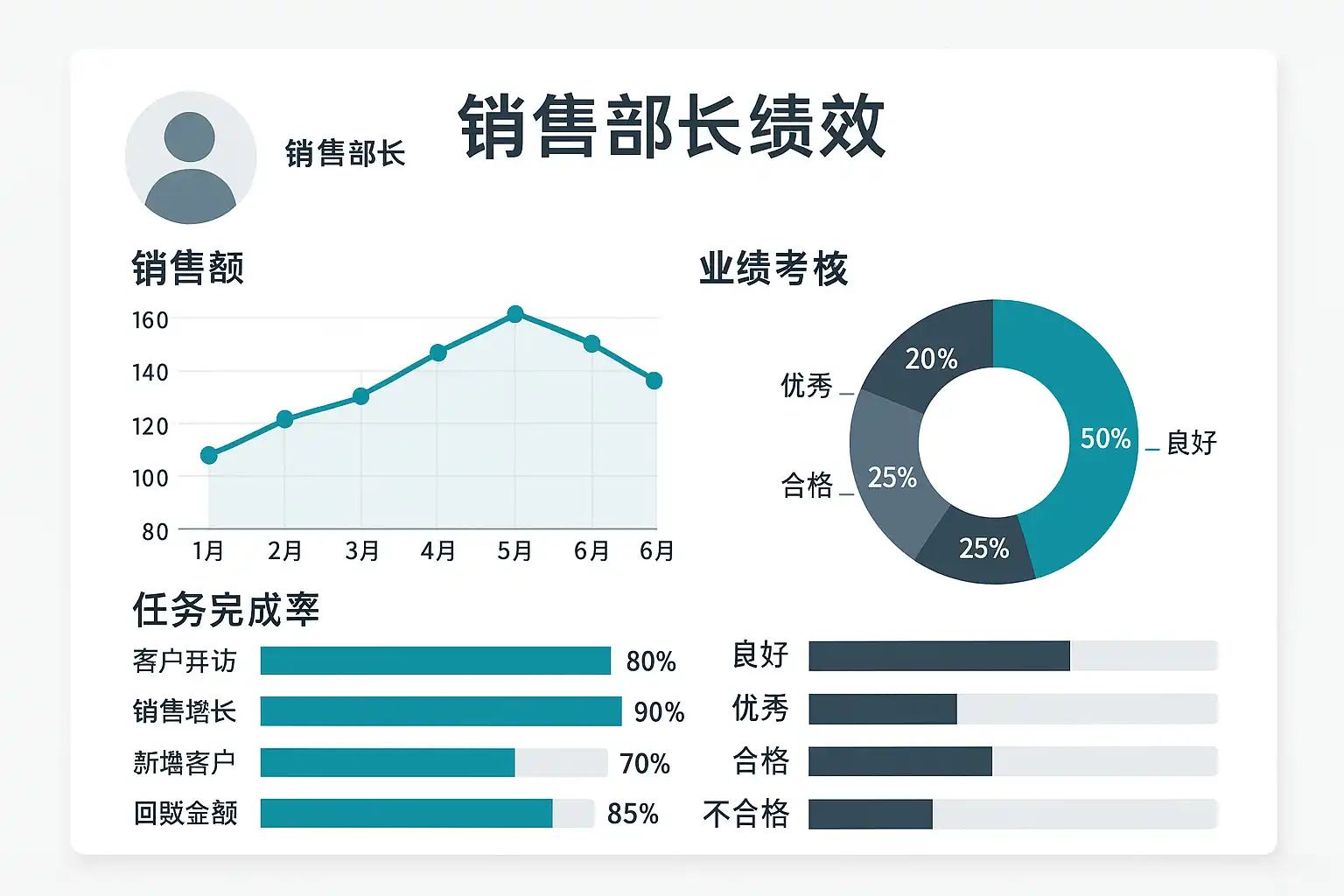 - 业绩指标:如销售额完成率、客户新增数、利润率等,数据化展示业绩达成情况。