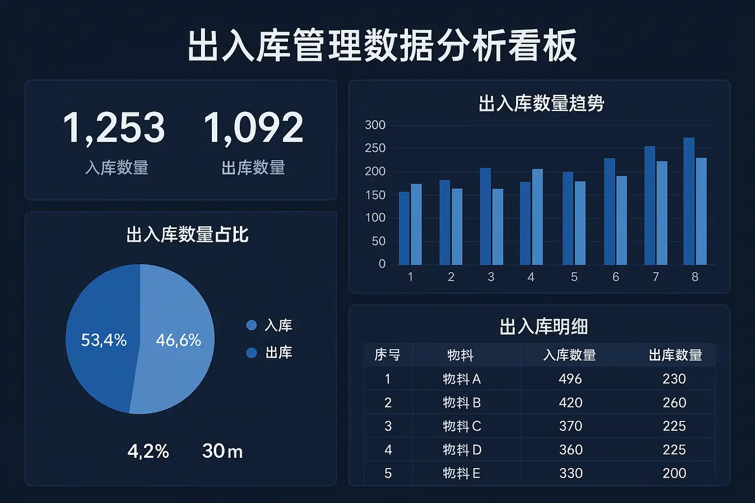 出入库管理数据分析看板,是一种基于大数据和可视化技术,将仓库内商品进出、库存变化等核心指标以图表形式动态展现的信息系统。它支持实时采集和集成不同业务环节的数据,并以直观界面帮助各级管理者把握运营全貌。