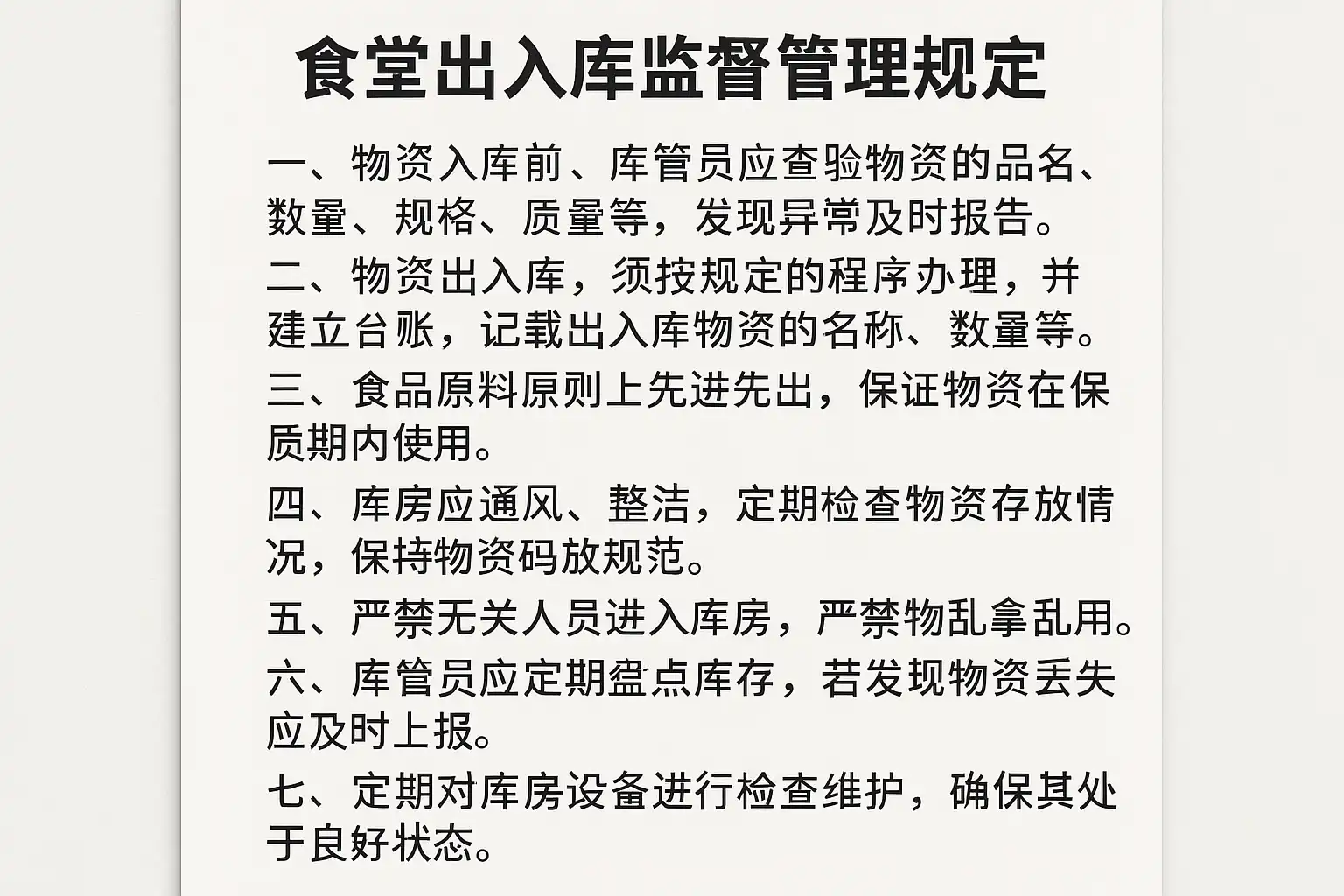 食堂出入库监督管理规定主要涵盖以下核心内容: