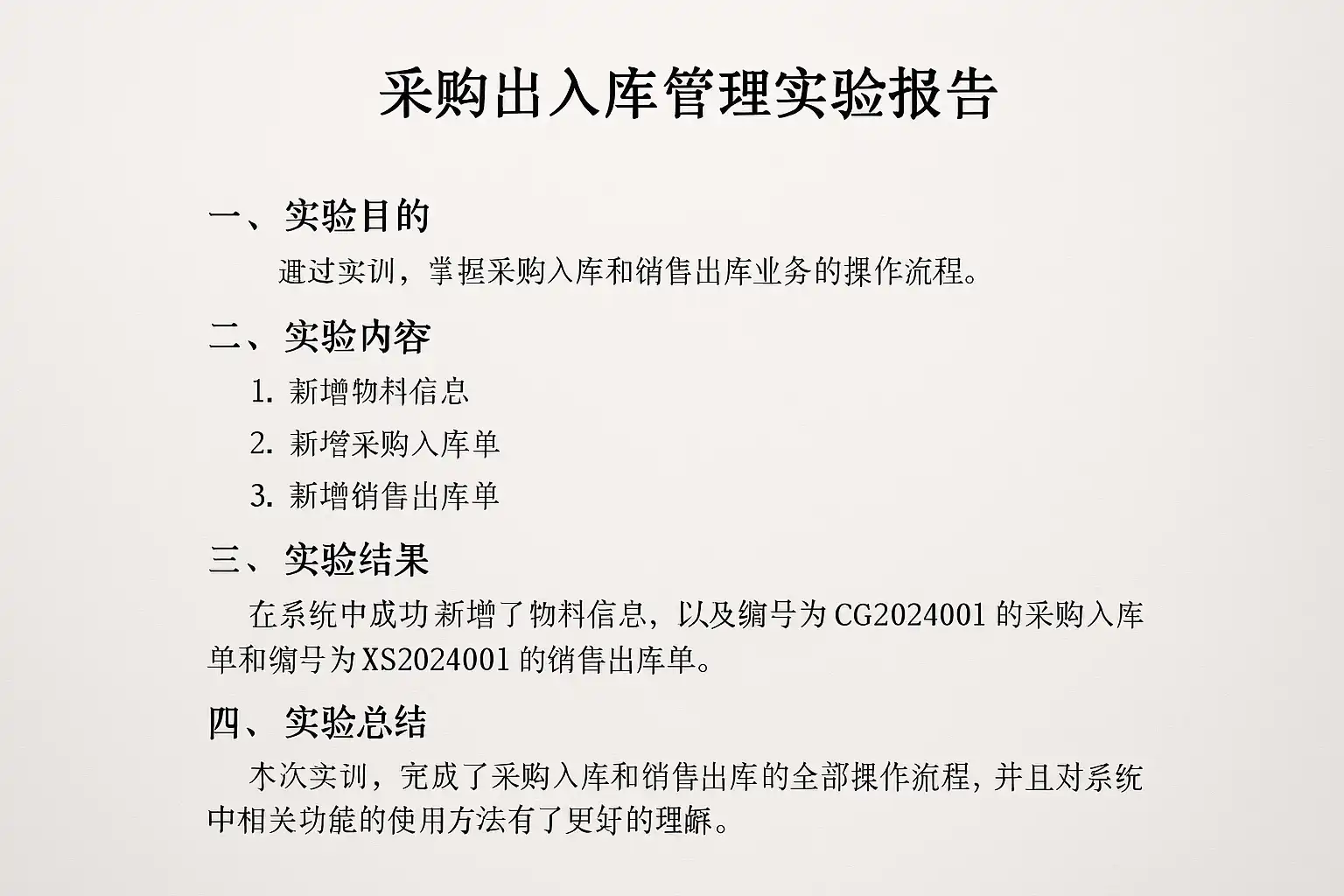 采购出入库管理实验报告主要涵盖以下核心内容: