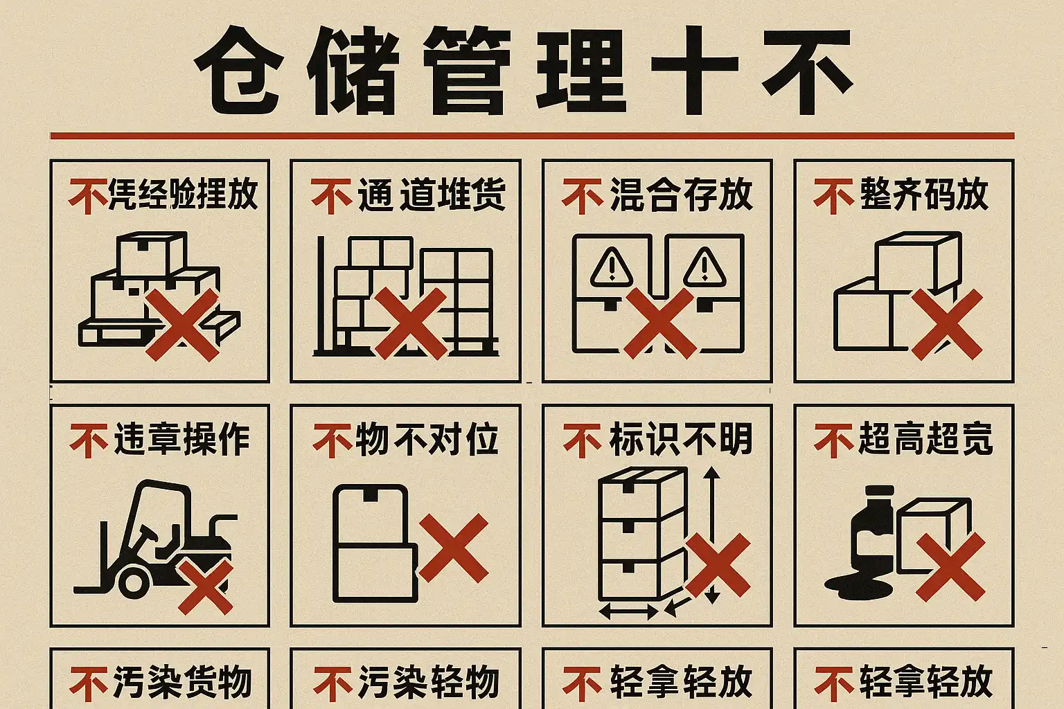 仓储管理的“十不”原则是指在仓库操作和管理过程中应避免的十种常见错误,以提升效率和安全性。具体包括: