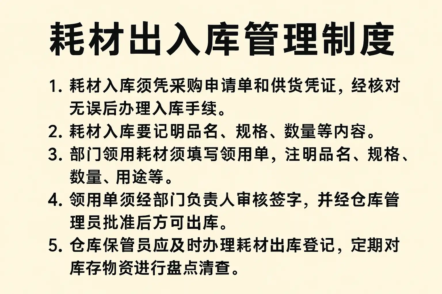 提升库存准确率的关键在于完善的耗材出入库管理制度,包括: