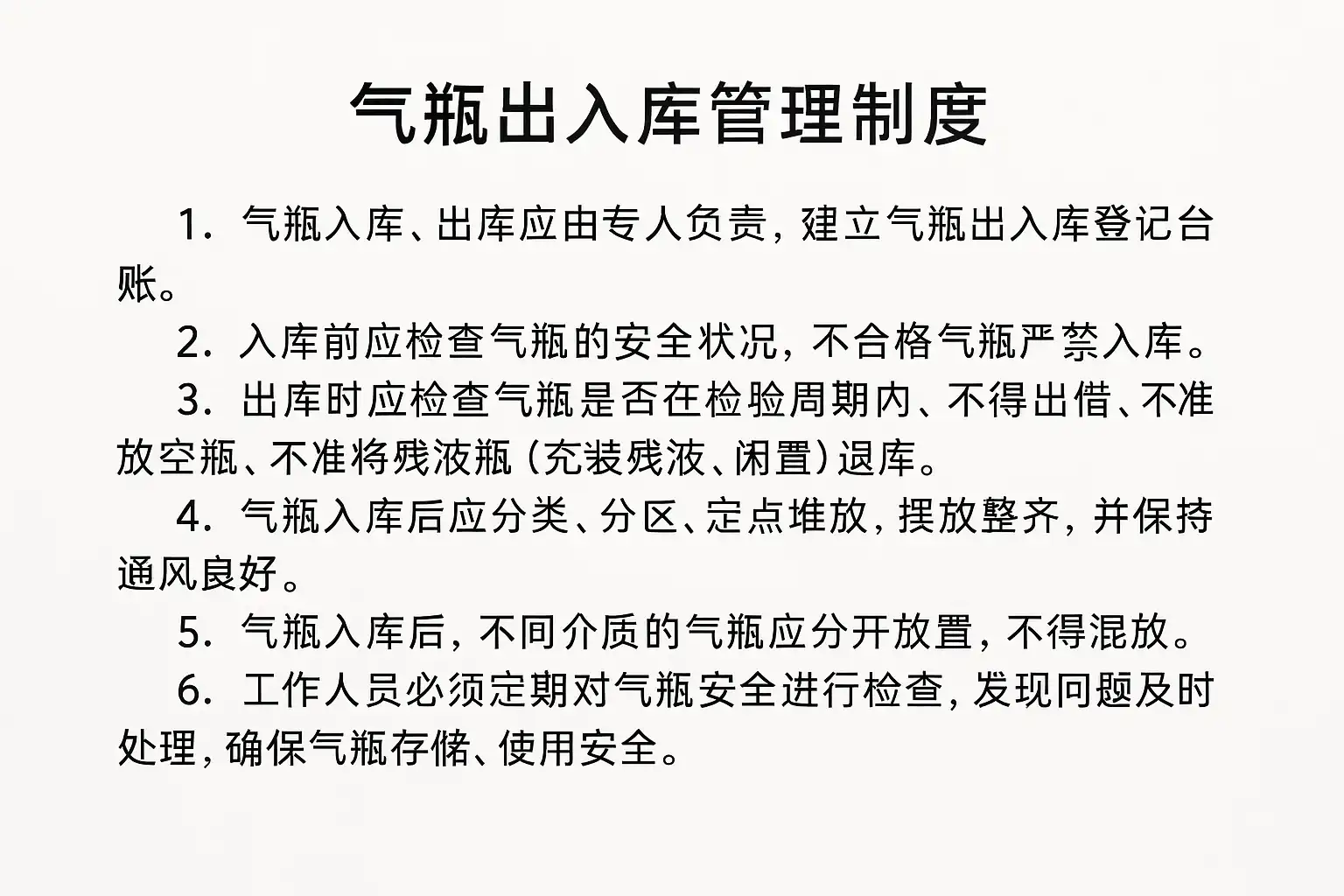 - 出入库流程规范:明确气瓶进库、出库及中转的操作步骤,确保信息及时更新。