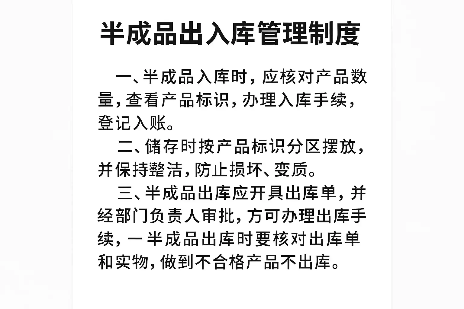 半成品出入库作为连接生产环节与成品仓储的重要枢纽,其管理规范直接影响到生产效率和产品质量。标准的半成品出入库管理制度一般包括以下几个核心环节: