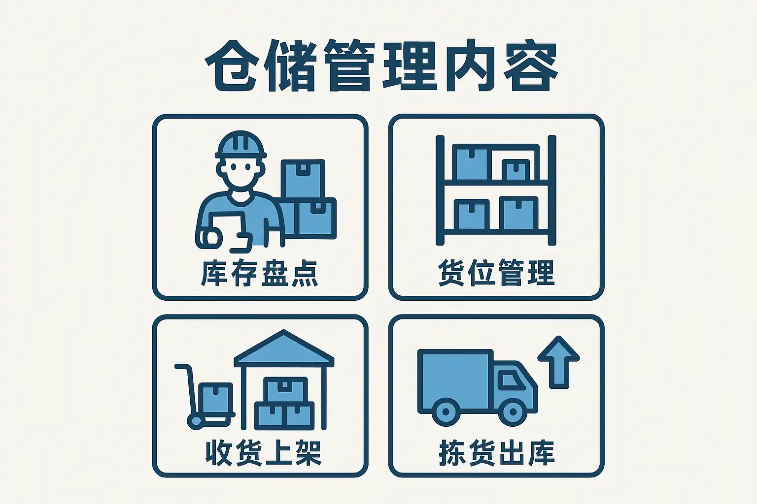 仓储管理是指对仓库内货物的收货、存储、保管和发货等全过程进行有效组织和控制。其核心内容主要包括: