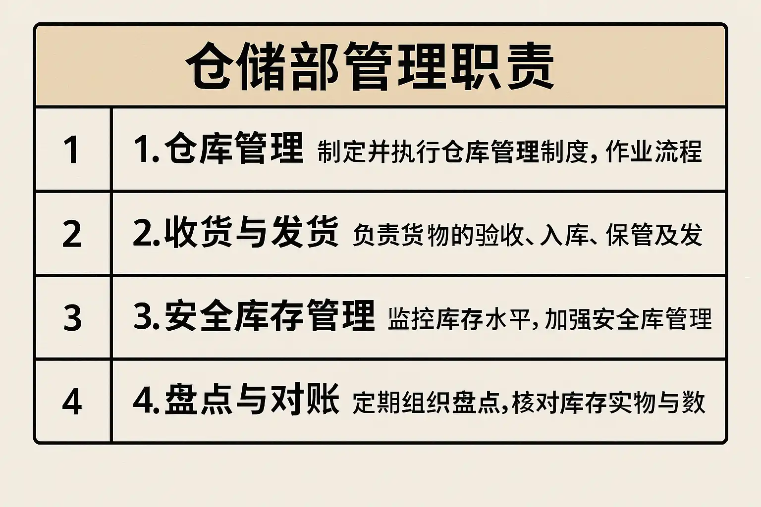 仓储部作为企业物流链中枢,其管理职责涵盖了物资从入库到出库全过程。主要包括以下五大方面:
