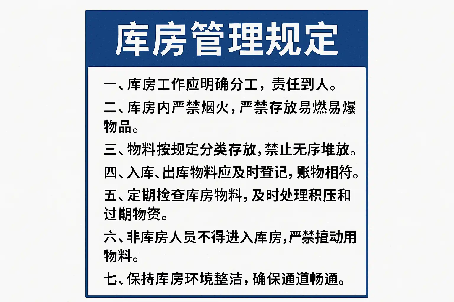 我刚接手库房管理工作,听说制定合理的库房管理规定非常重要。具体来说,库房管理规定到底包含哪些核心内容?有没有详细的条目或者标准流程?