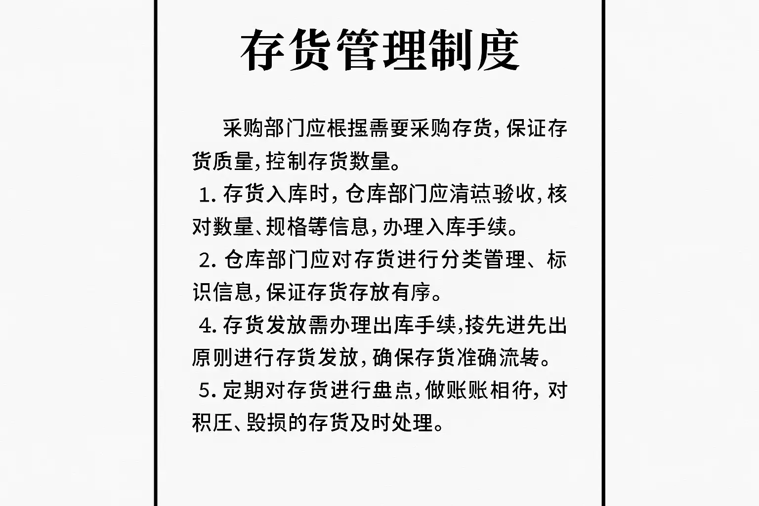 - 存货保管要求:明确仓库环境、存放方式及安全措施,防止损坏和丢失。