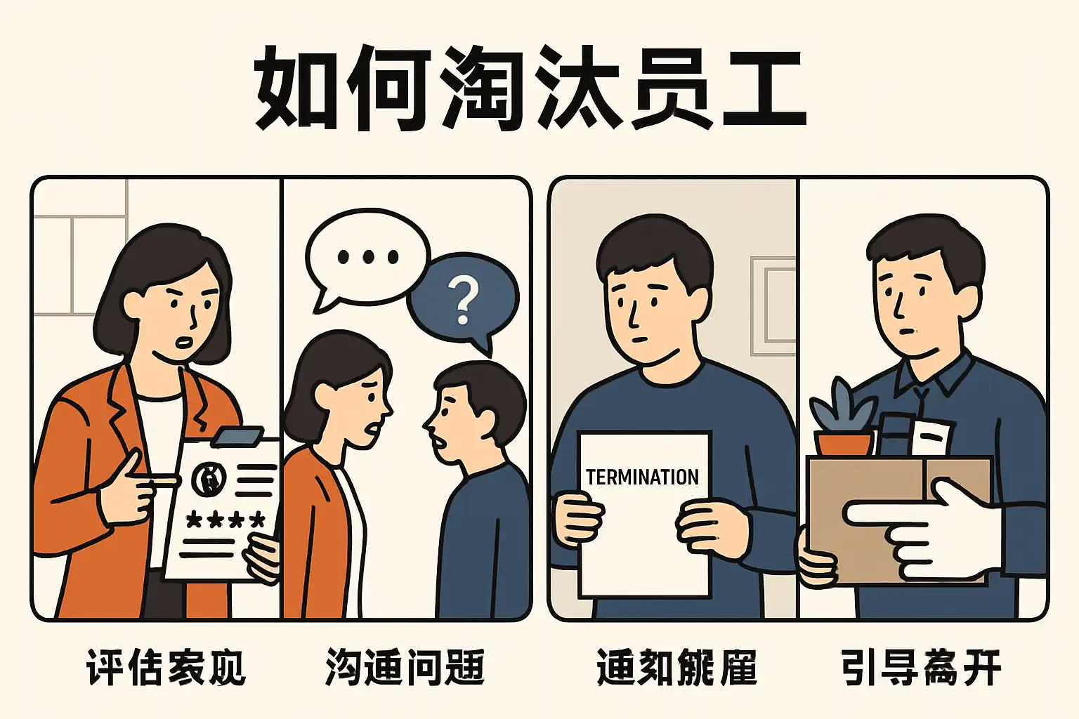 - 实施渐进式淘汰流程,如警告、试用期延长、最终解聘;