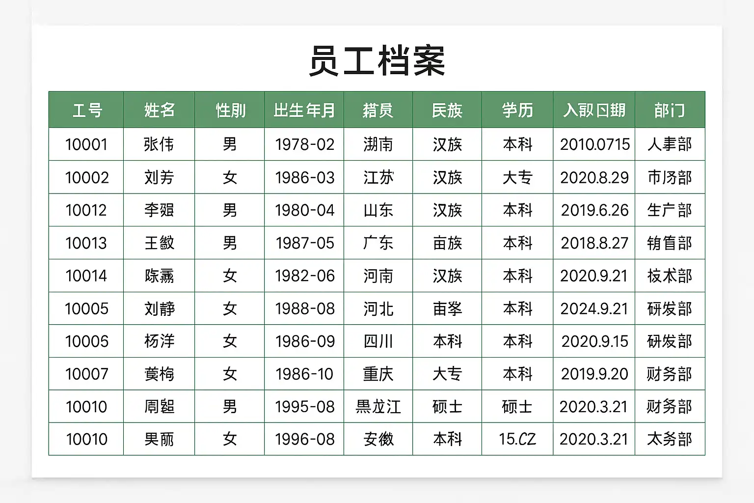 - 利用数据验证(Data Validation)限制输入内容,减少错误,如限定部门、职位范围。
