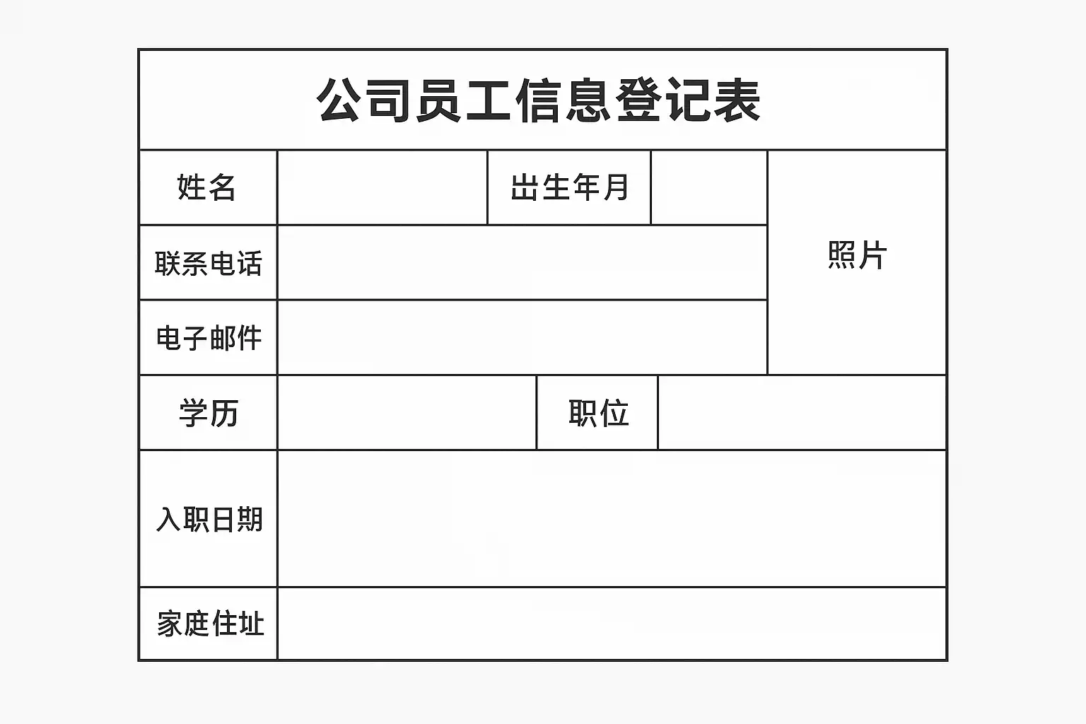 我正在制作公司的员工信息登记表,但不确定哪些字段是必须的。有没有一份包含关键字段的模板可以参考,确保收集的信息全面且实用?