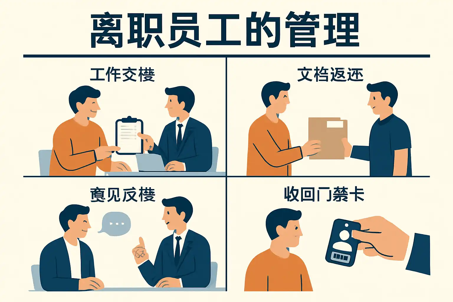 - 及时回收访问权限:确保离职当日立即撤销所有系统账户与门禁权限,防止未经授权访问。