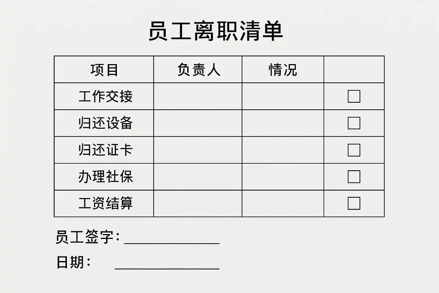 一份完善的员工离职清单需覆盖以下主要维度: