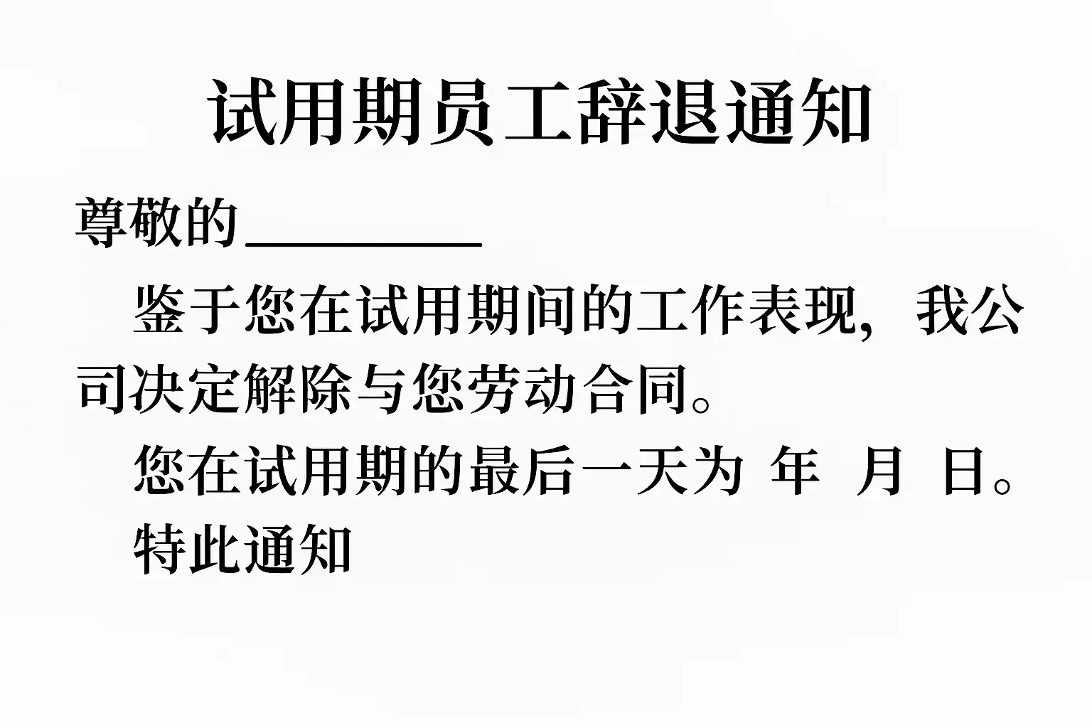 - 结算工资及相关补偿。 案例:某公司因员工绩效未达标,在试用期第20天发出书面通知,并提前3天告知离职,完成合法合规的辞退程序。