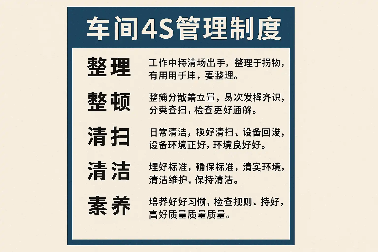 我刚接触车间管理,听说4S管理制度对提升生产效率很重要,但具体包括哪些内容呢?能帮我理清楚车间4S管理制度的核心要素吗?