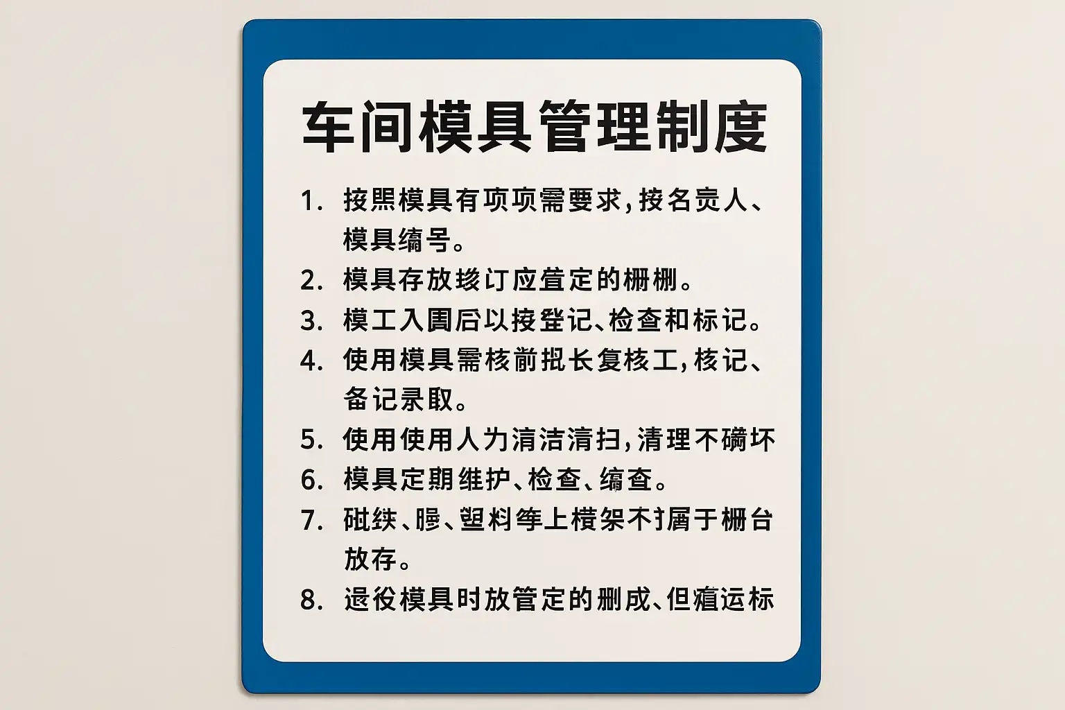 - 明确责任划分 每套模具指定专人负责,从交接班文档中逐级落实到个人绩效指标(KPI)。