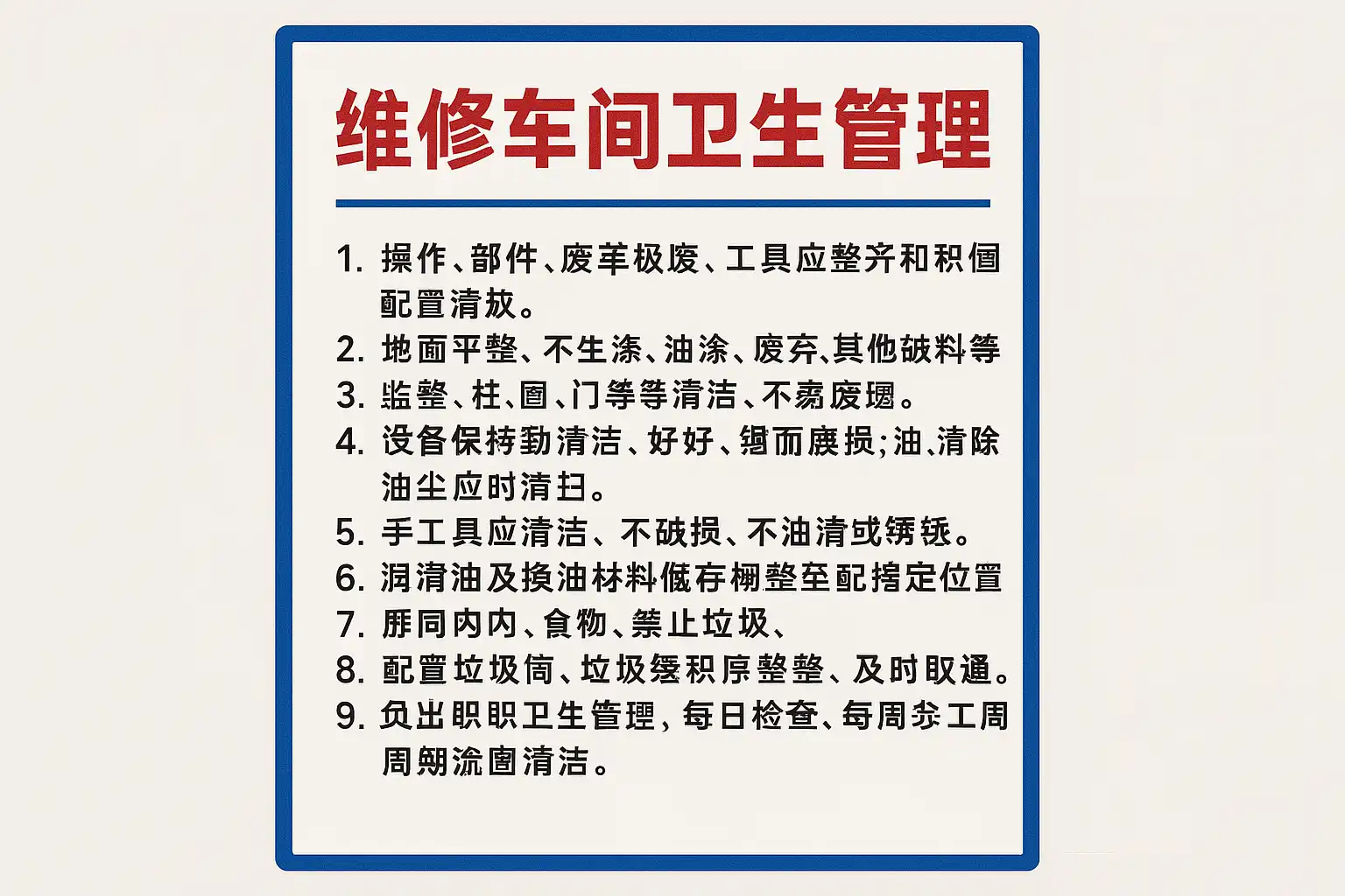 提升维修车间卫生管理效率,关键在于制定科学的清洁流程和合理分工。具体措施包括: