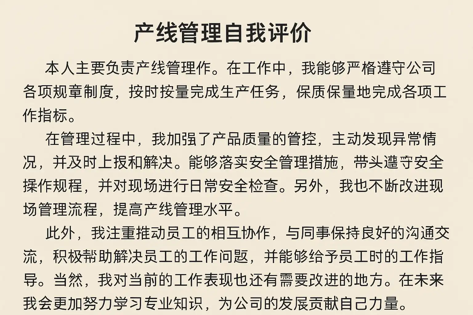 以下为一份标准且高效的产线管理自我评价范文片段,以供参考: