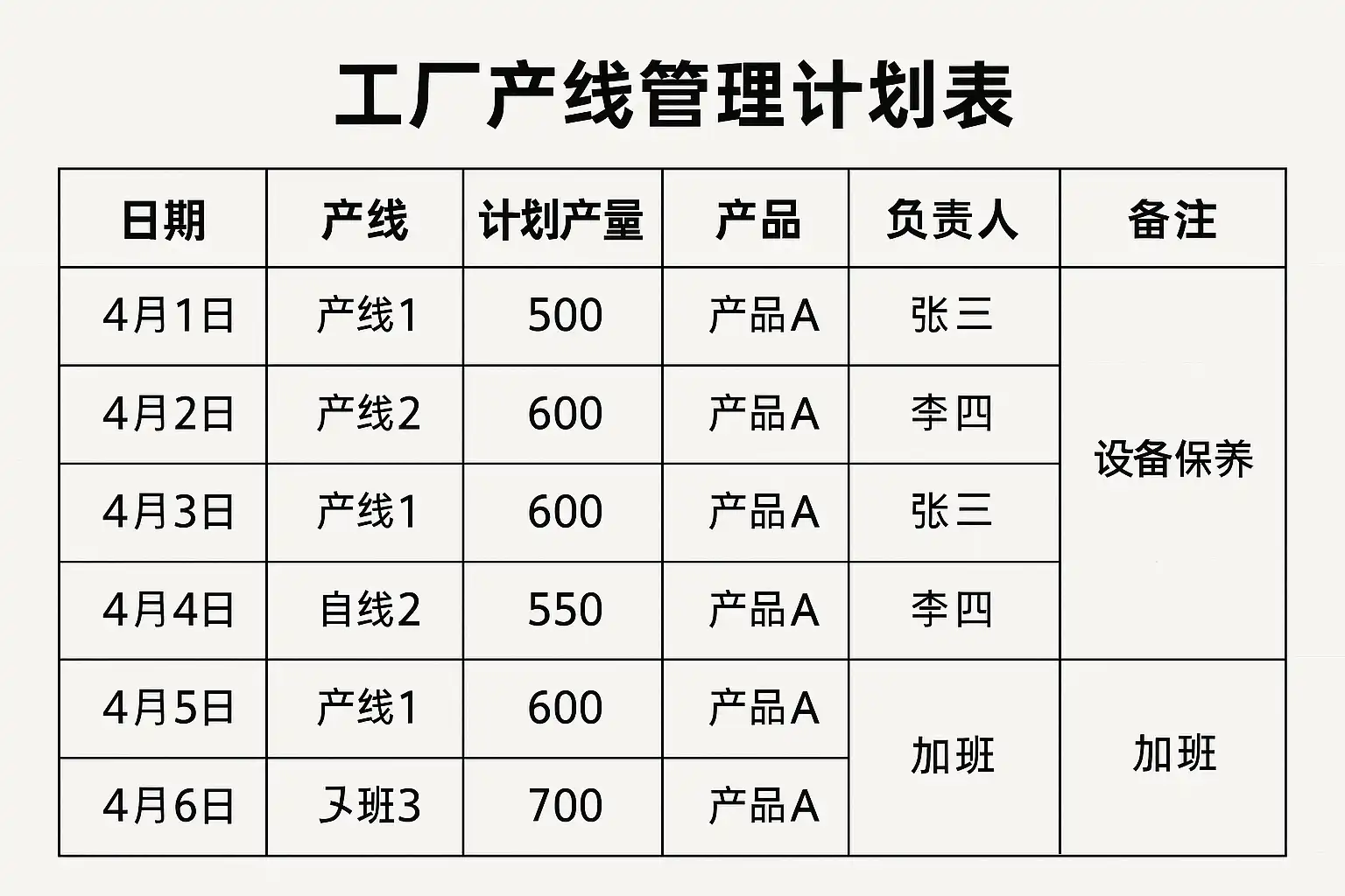 以下为一份典型周度工厂产线管理计划表示例: