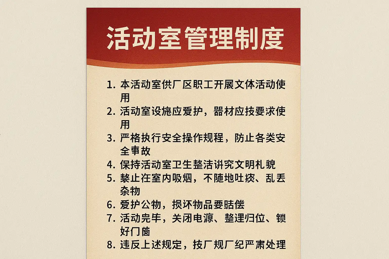 - 使用时间规定:明确活动室开放时间段,避免影响生产秩序。