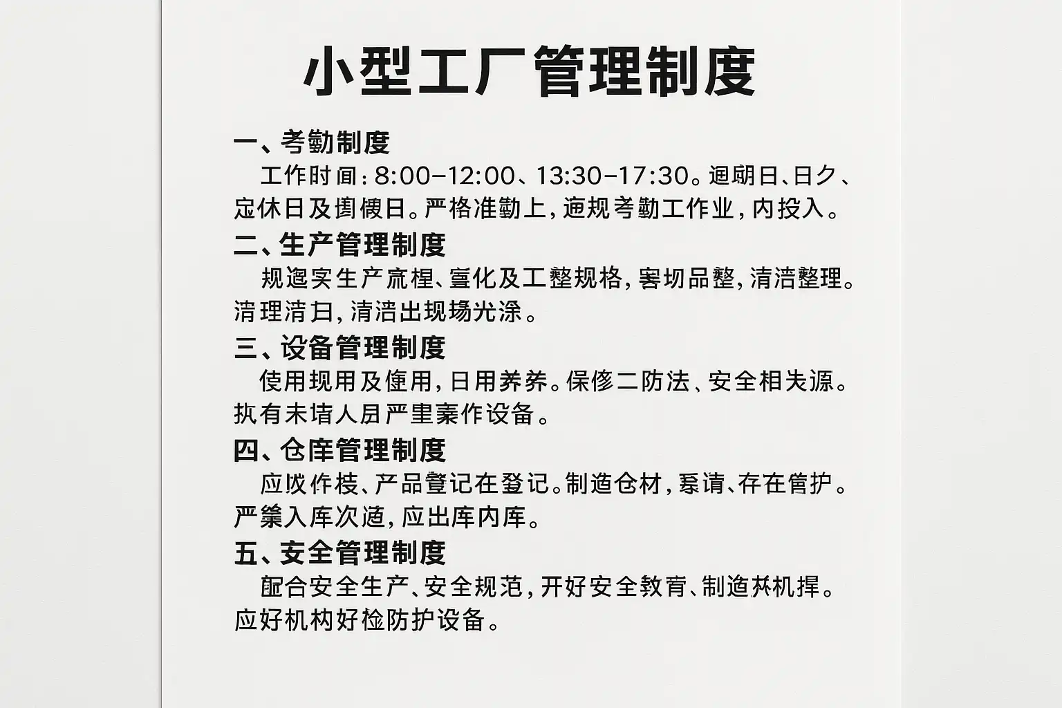 通过本文详细梳理可以看出,小型工厂要想高效健康发展,其管理制度必须做到“有章可循、有据可依”。建议从以下方面着手: