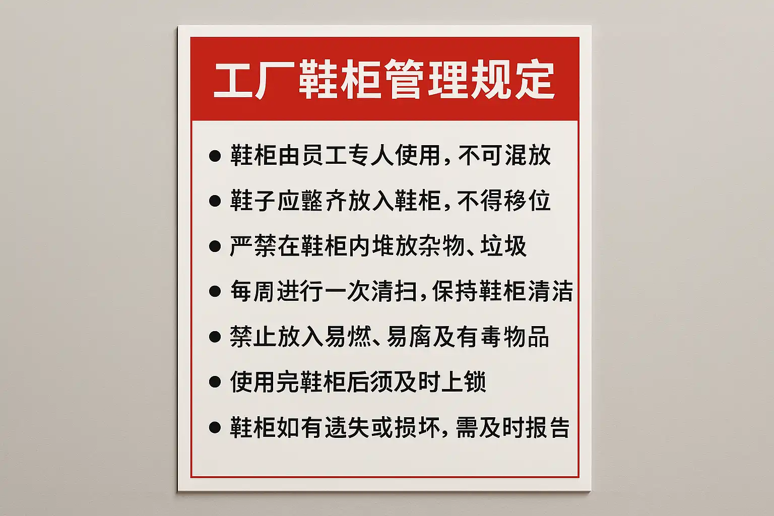 - 规范物品存放:只允许存放工作相关鞋类,禁止存放易燃易爆及私人物品。