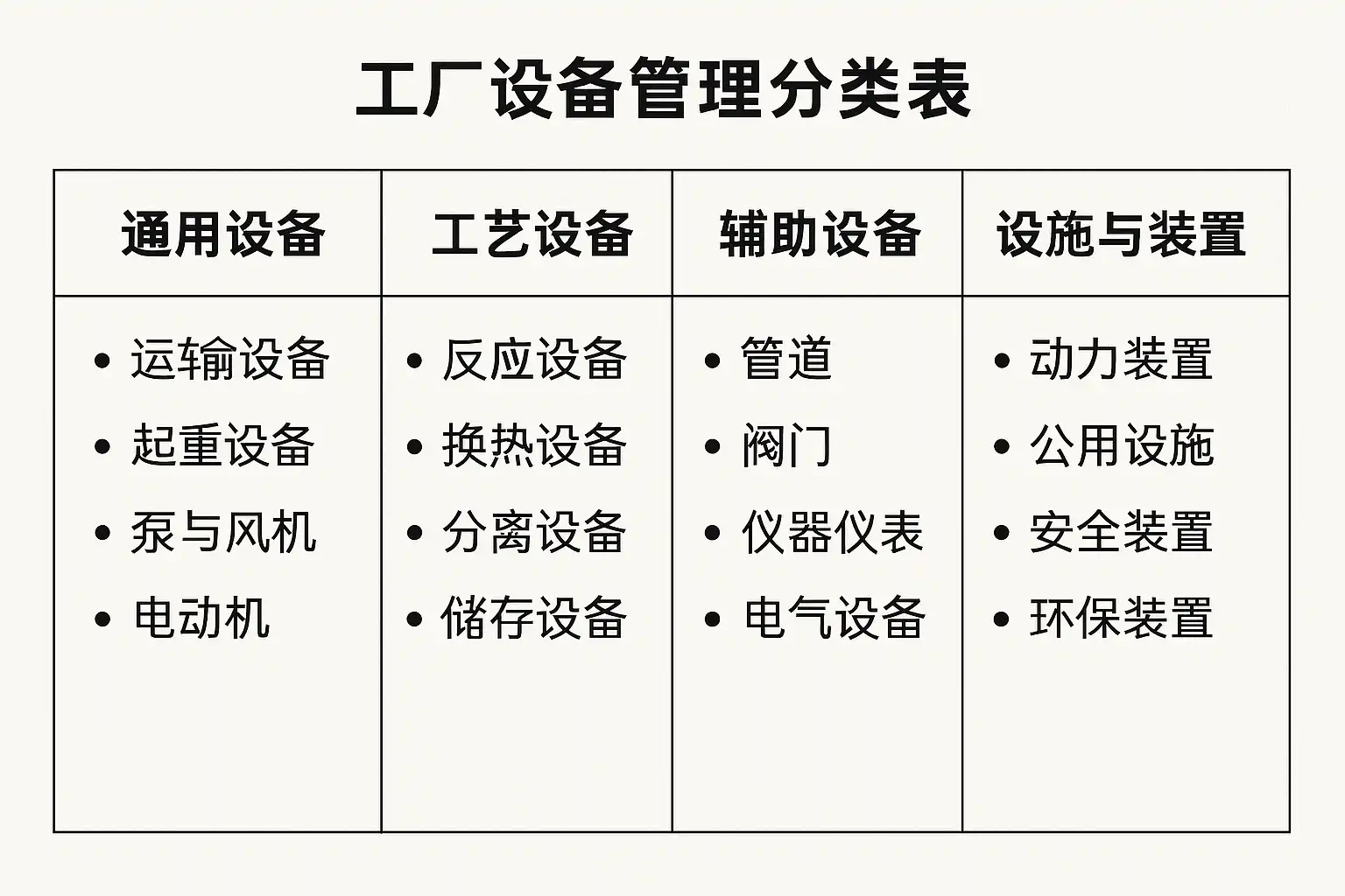 我在整理工厂设备时,发现设备种类繁多,不知道如何科学划分类别。工厂设备管理分类表具体包含哪些主要类别?这些分类对后续管理有什么帮助?