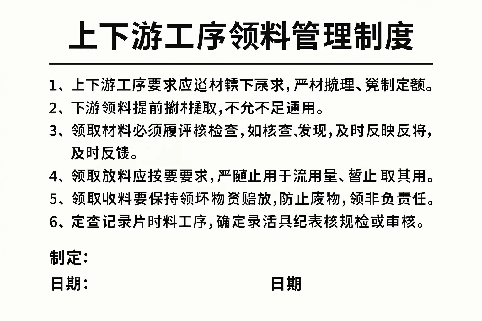 上下游工序领料管理制度是指在制造业或生产环节中,针对不同工序之间物料领取和流转所制定的规范流程与管理方法。它明确了上游工序向下游工序提供原材料或半成品的责任和标准,确保物料按需及时供应,避免库存积压和缺料现象。通过规范化管理,上下游之间实现有序衔接,提高整体生产效率。