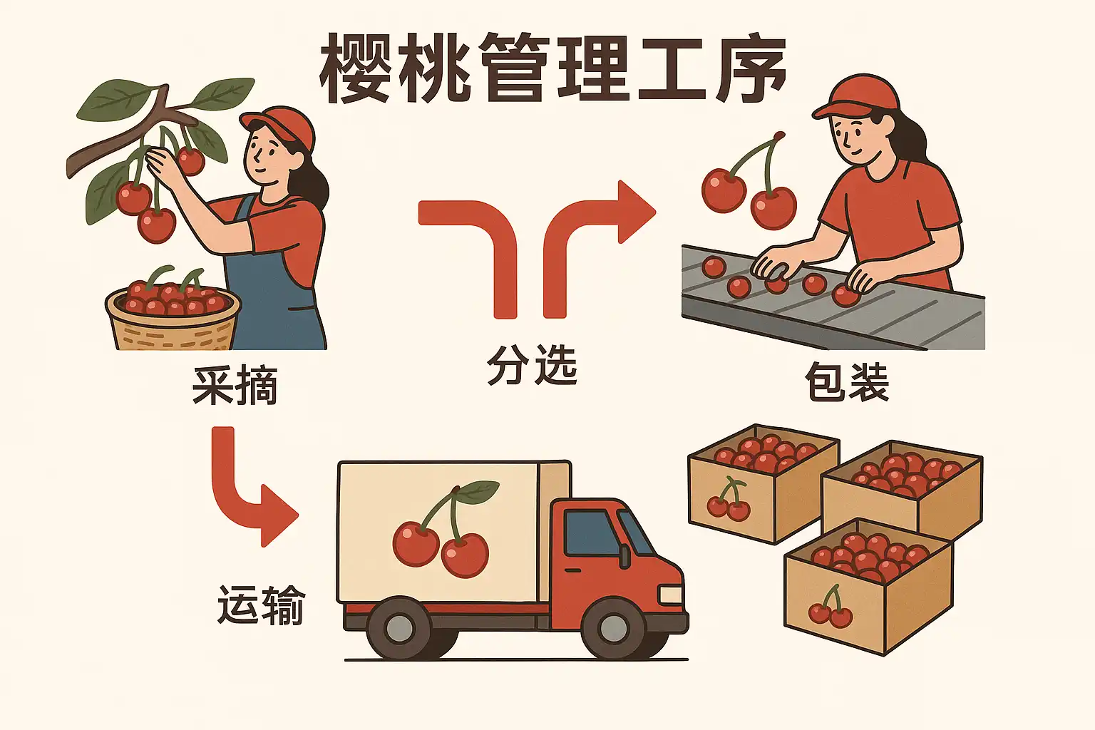 樱桃管理工序中,关键环节包括花期管理、病虫害防治、灌溉调控和采收时机。具体如下: