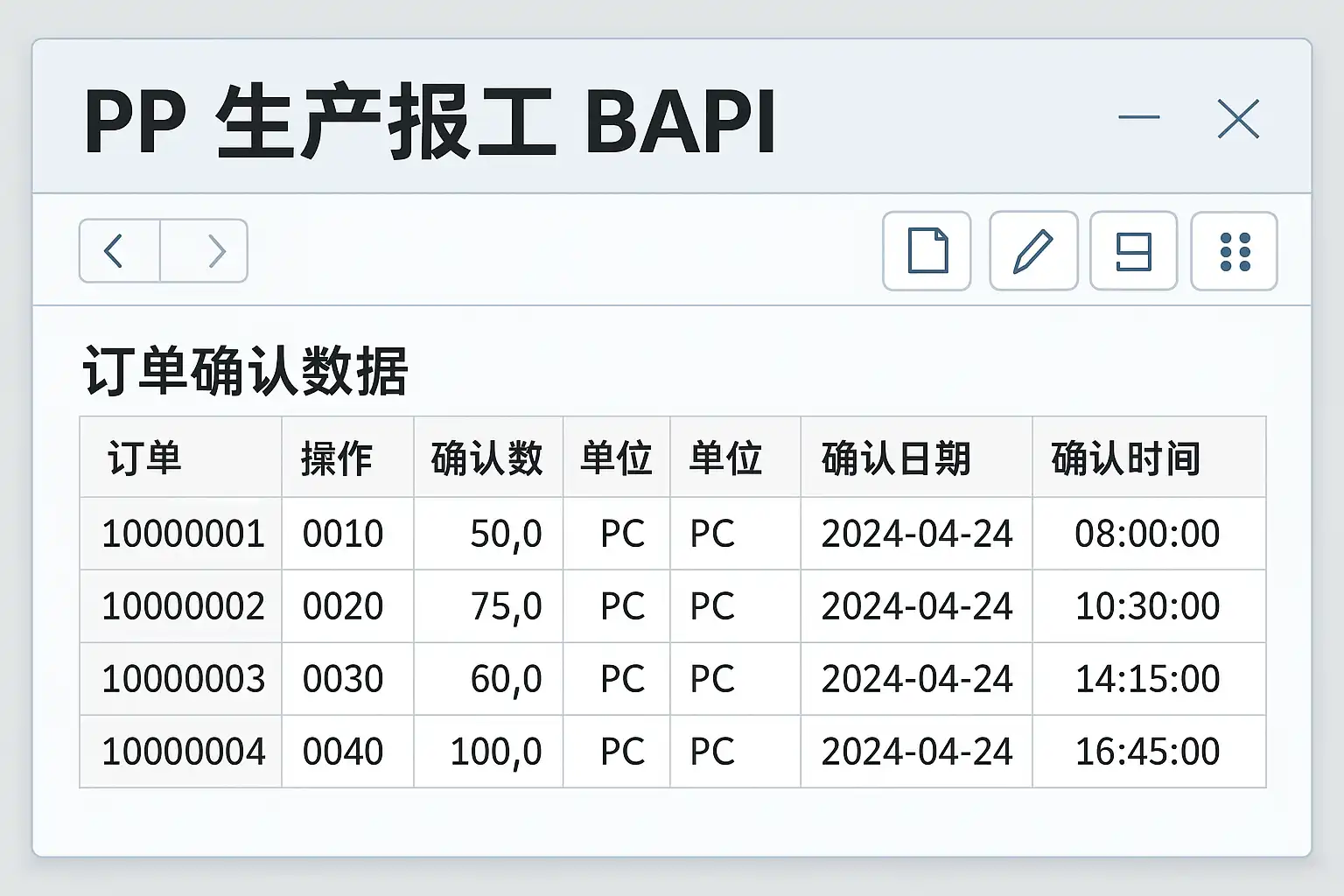 SAP PP模块中的报工(Confirmation)环节,是指对生产订单的作业完成情况进行信息录入,包括产量、良品、不良品、耗用物料等。BAPI(Business Application Programming Interface)是SAP提供的标准接口,用于系统间数据交互,实现自动或半自动的数据上传。