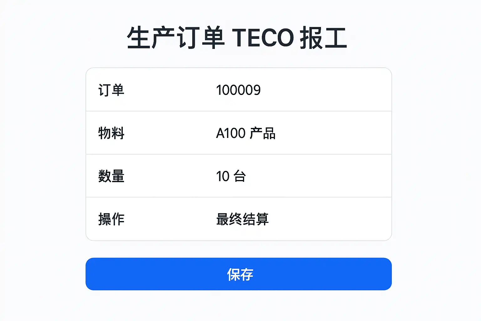 - TECO(技术完成)操作执行:系统标记该订单为‘技术完成’状态,停止进一步操作。通过上述步骤,能够保证报工数据的准确性和完整性,提高后续财务及库存管理效率。