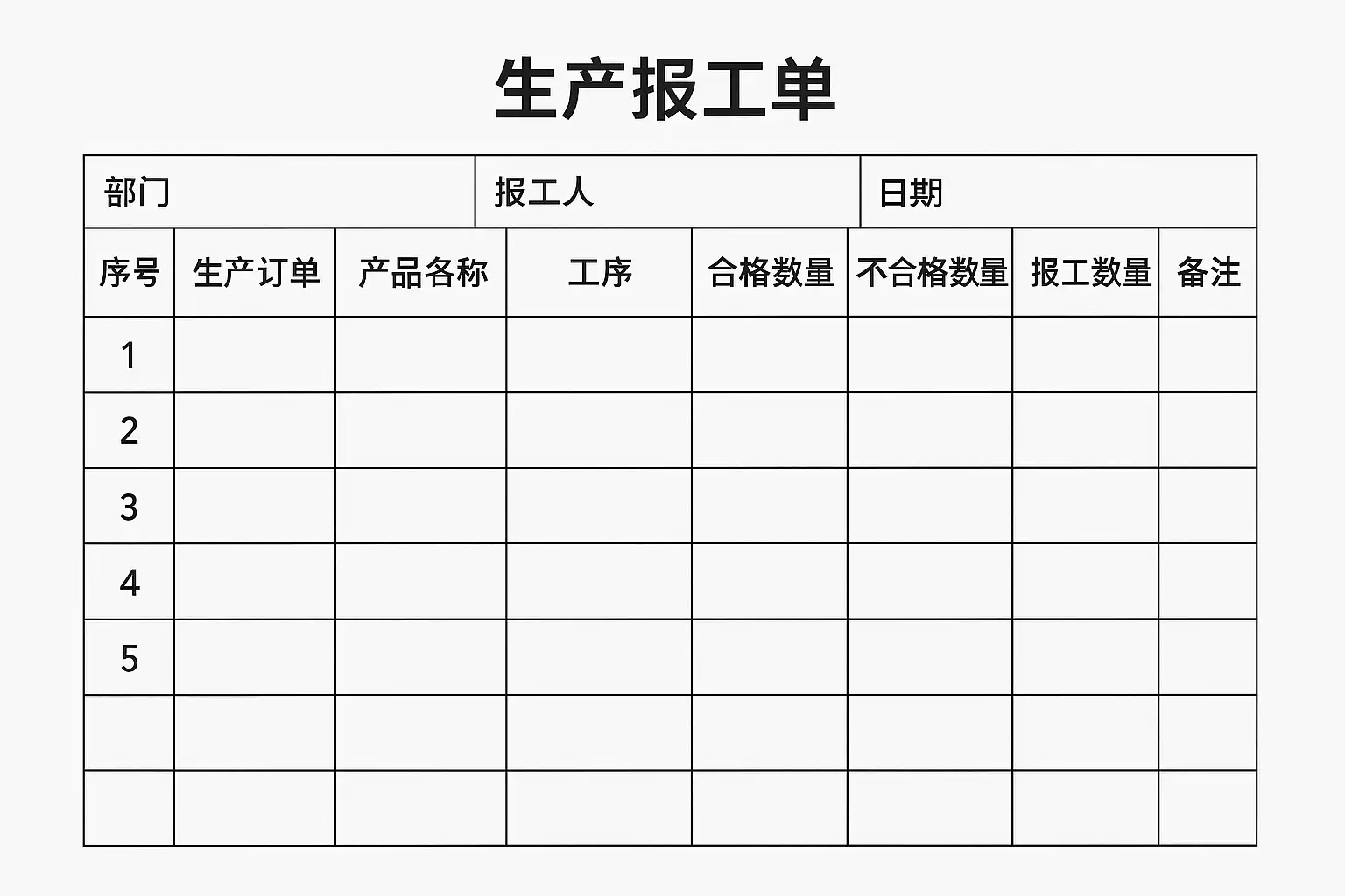 定义 生产报工单,又称为“车间报工单”或“作业完成报告”,是指企业车间员工在完成某项作业或产品加工后,将相关信息(如产量、班组、人工用时等)按照规定格式填写并上交的一种原始记录凭证。它是企业进行产量统计、成本核算和绩效考核的重要基础资料。