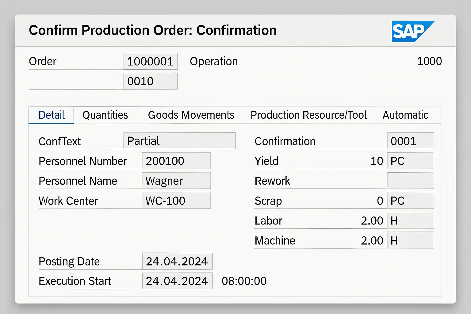 生产订单报工定义 生产订单报工是指将制造过程中各环节的实际作业情况(如产出数量、消耗物料、人员及设备使用等)及时准确地记录到SAP系统,以便于后续成本核算、进度跟踪与质量追溯。
