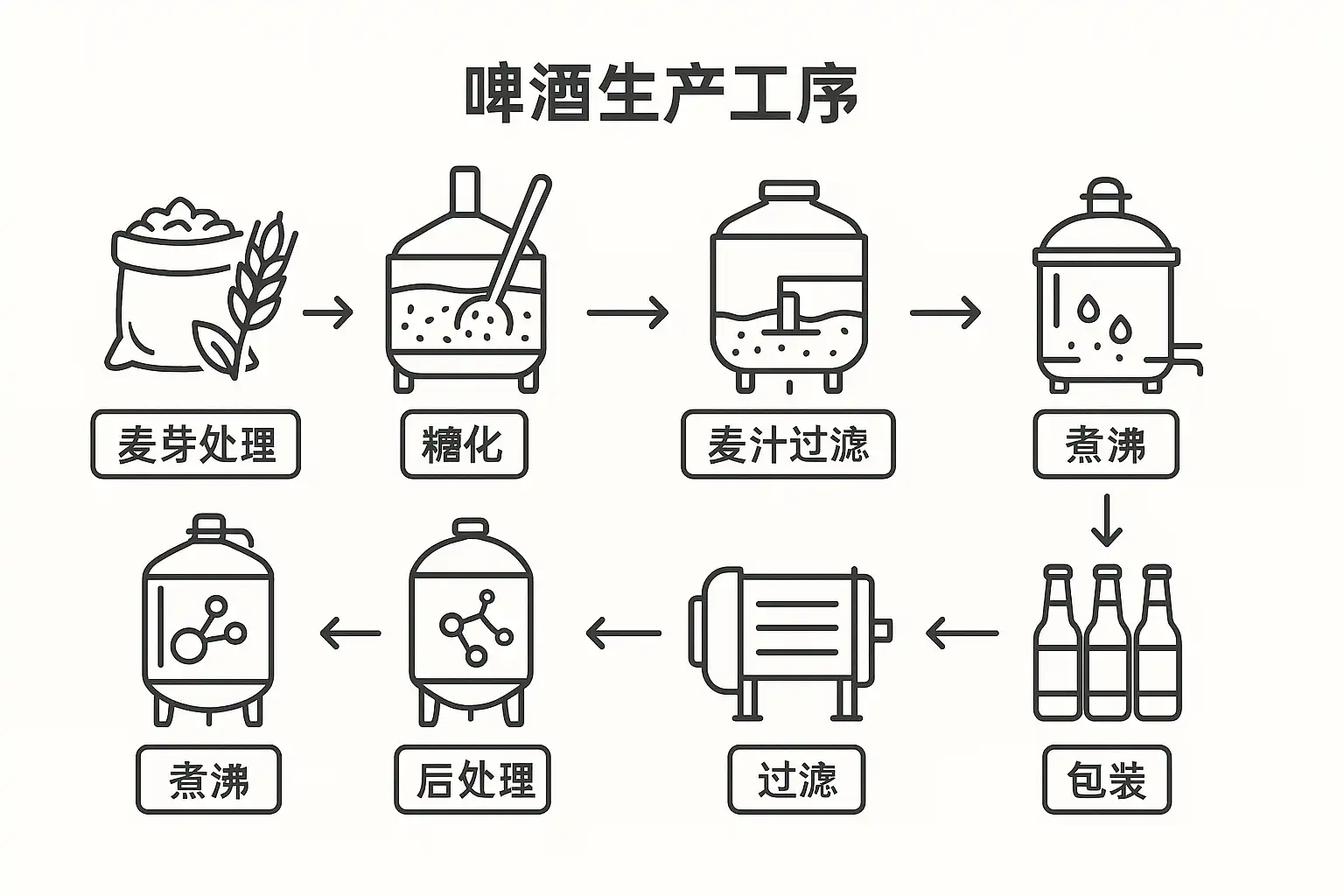 啤酒生产工序主要包括以下五个关键步骤:1. 原料准备(麦芽、啤酒花、水);2. 糖化(将麦芽中的淀粉转化为糖);3. 发酵(利用酵母将糖转化为酒精和二氧化碳);4. 过滤与澄清(去除杂质,保证清澈);5. 灌装与包装。每一步通过严格控制温度、时间和卫生条件,确保最终产品的质量稳定。