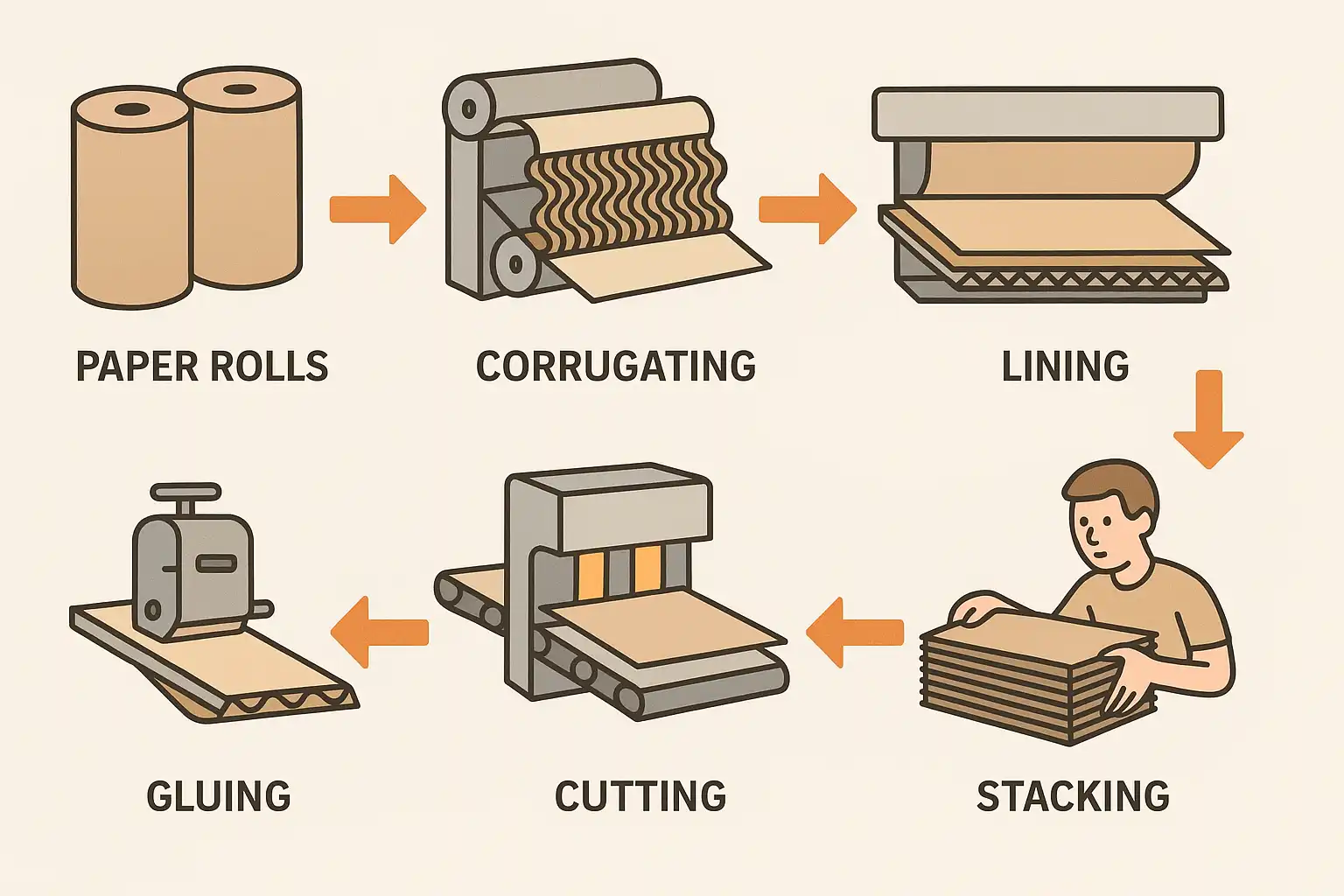我对纸板生产过程中的各个步骤感到好奇,想了解具体包括哪些工序?每个环节的作用是什么?