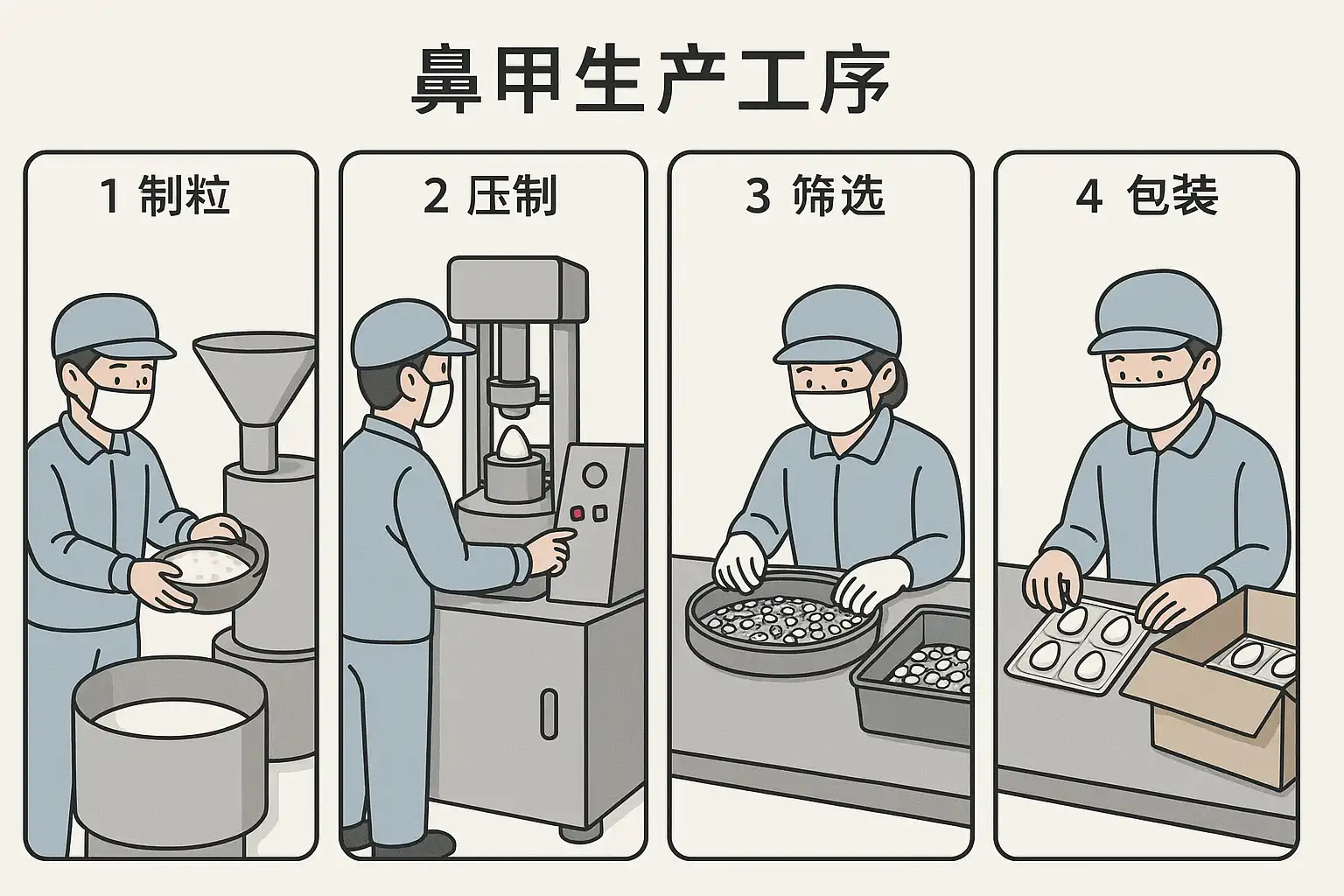我对鼻甲的生产流程不是很了解,想知道从原材料准备到成品出厂,具体都有哪些关键步骤?每个步骤对最终产品质量有什么影响?
