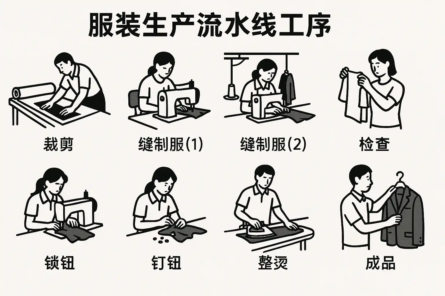 | 6. 后整 | 包括锁眼、钉扣、修剪多余线头 | 完善细节,提高品质 |