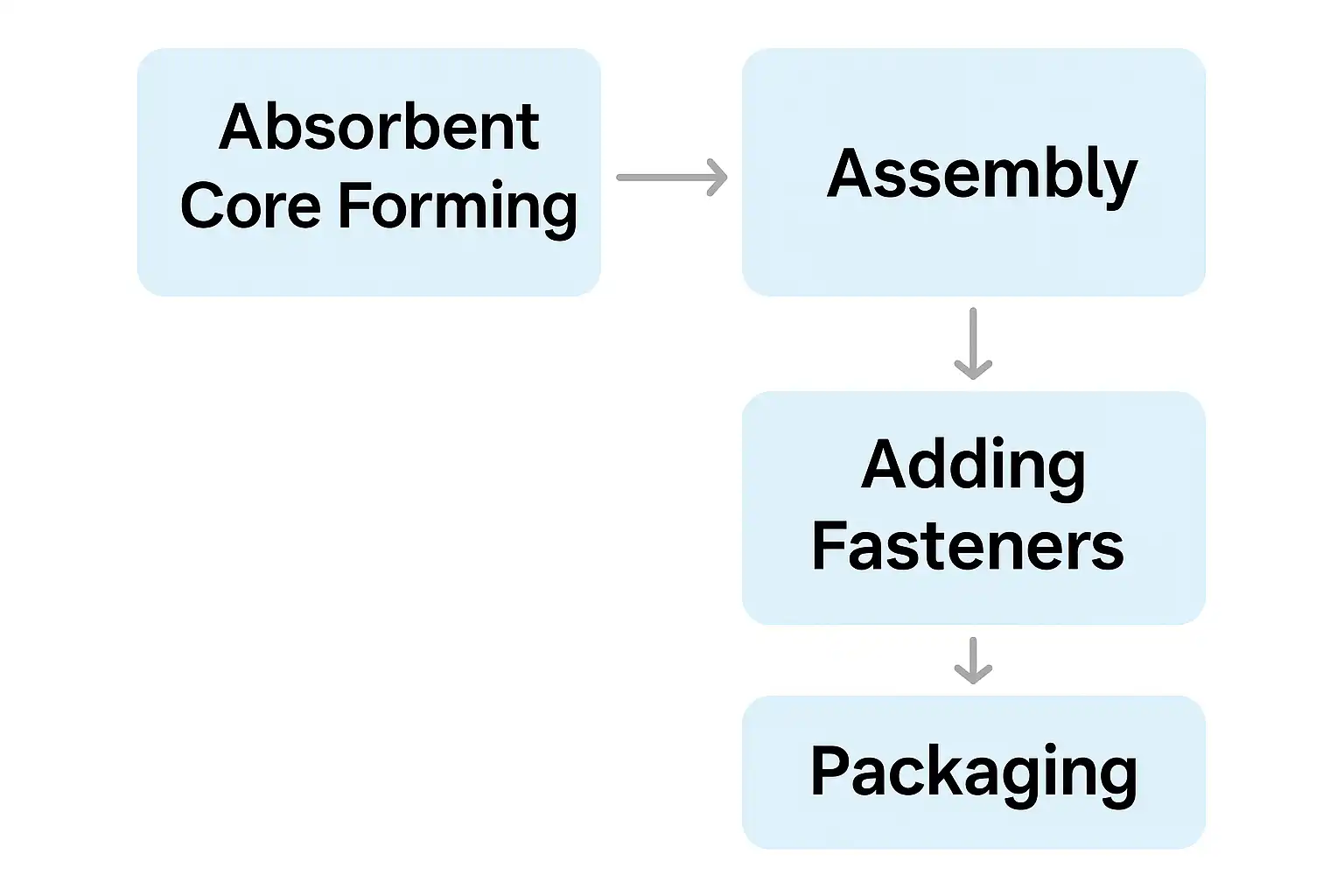 - 原材料准备:包括高分子吸水树脂(SAP)、绒毛浆和无纺布等,保证品质是产品性能的基础。