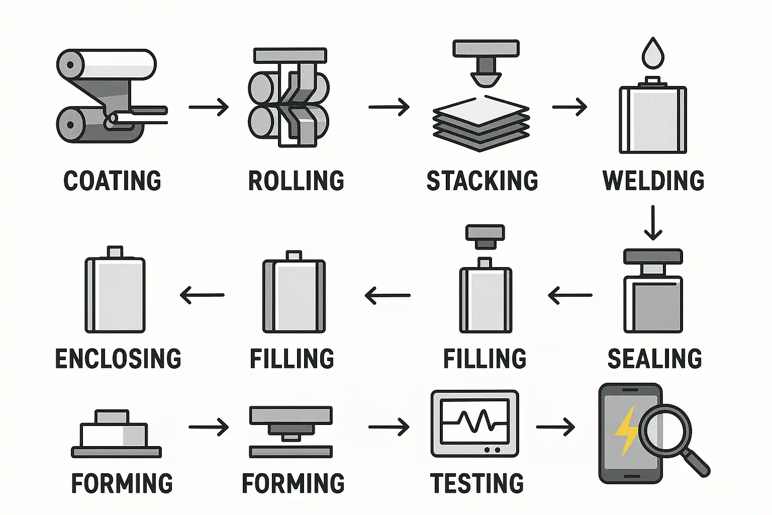 - 注液封装:注入电解液,并进行密封,确保密封性和安全性。