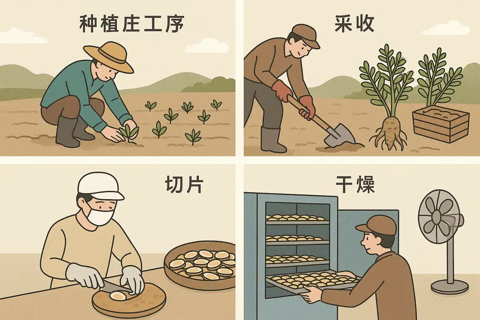 - 按照行业标准将主根横向或斜向切制成厚度1~3毫米不等薄片;