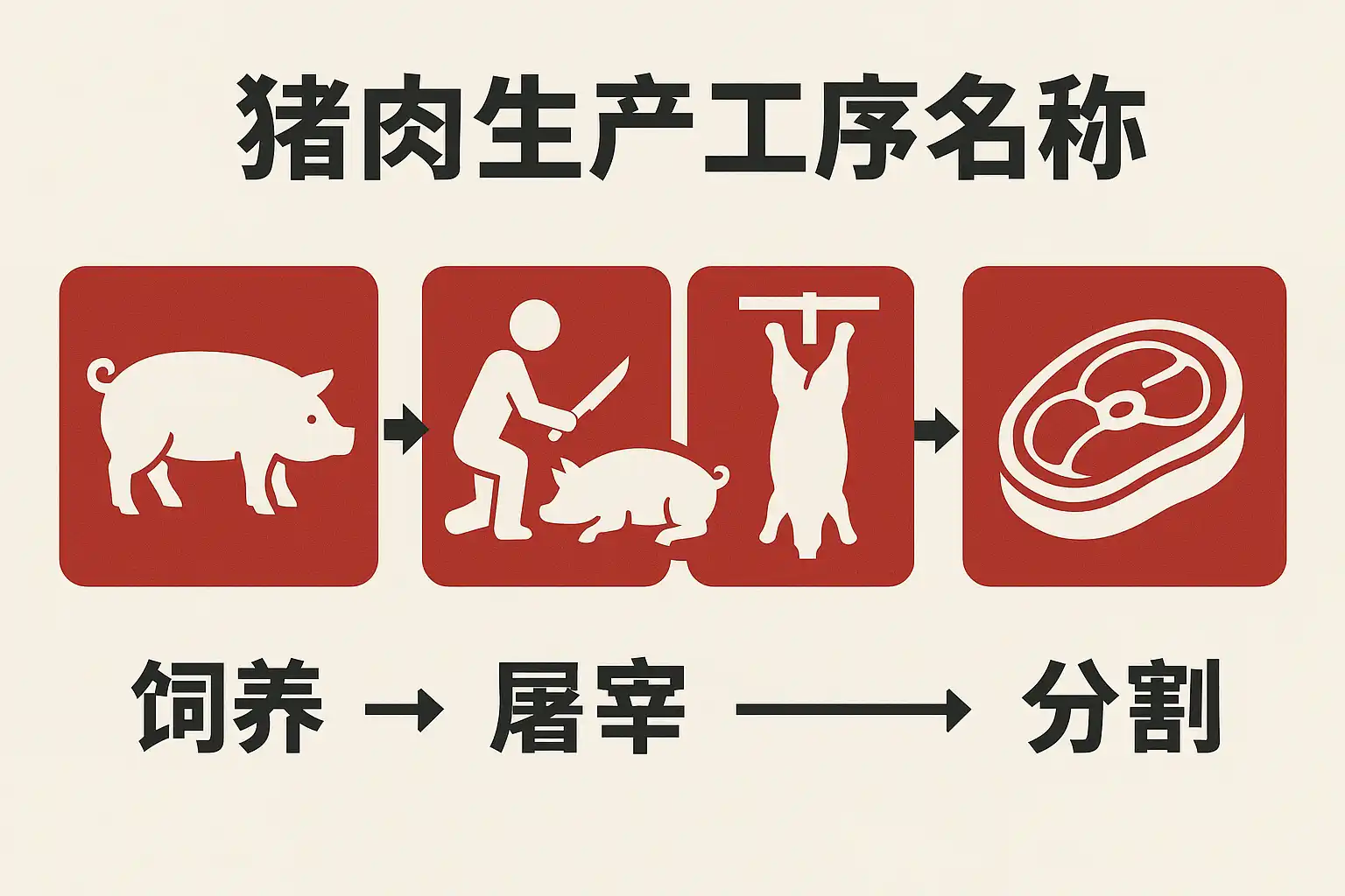 | 切割 | 按部位分割成不同切块 | 五花肉、里脊等分离 |