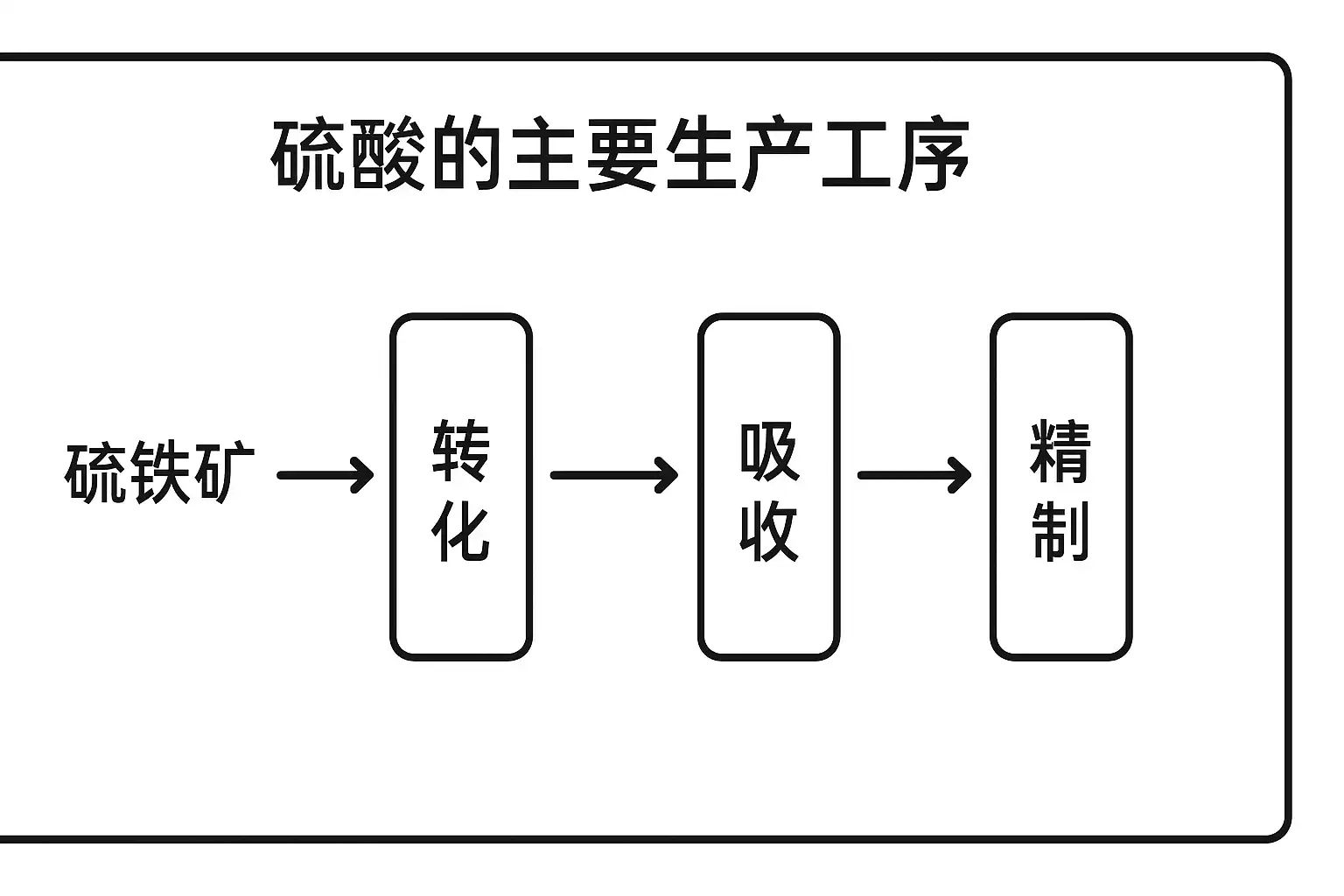 我最近对硫酸生产工序很感兴趣,想知道硫酸是如何一步步制成的。具体有哪些关键步骤,能不能帮我梳理一下整个流程?