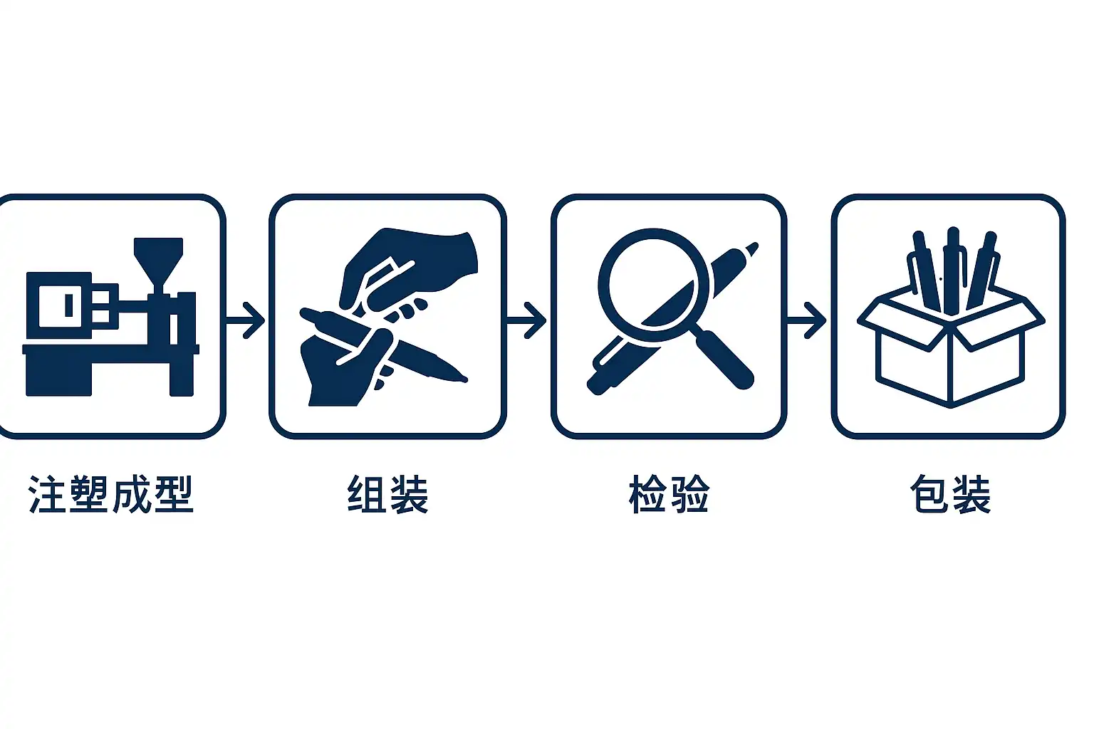 企业生产笔的工序主要包括设计规划、原材料准备、注塑成型、喷涂印刷、组装检测和包装发货六大关键步骤。具体流程如下: