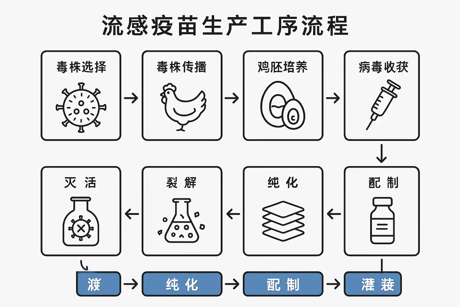 流感疫苗生产工序主要包括以下几个关键步骤: