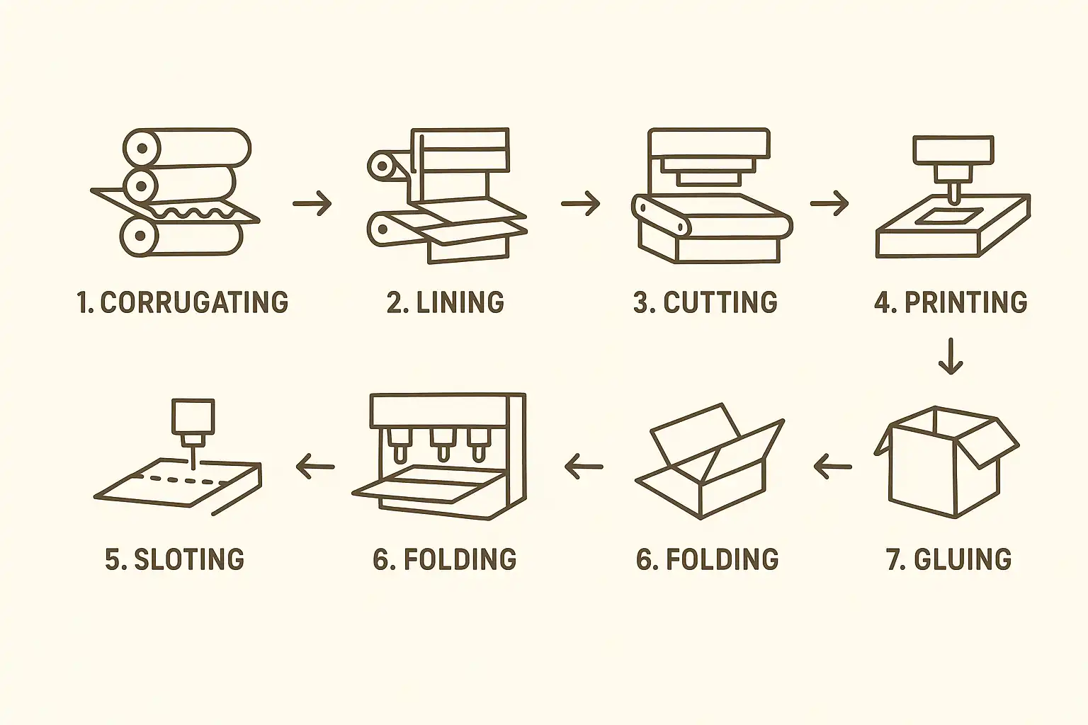 纸箱生产工序通常包括七个主要步骤,分别是: