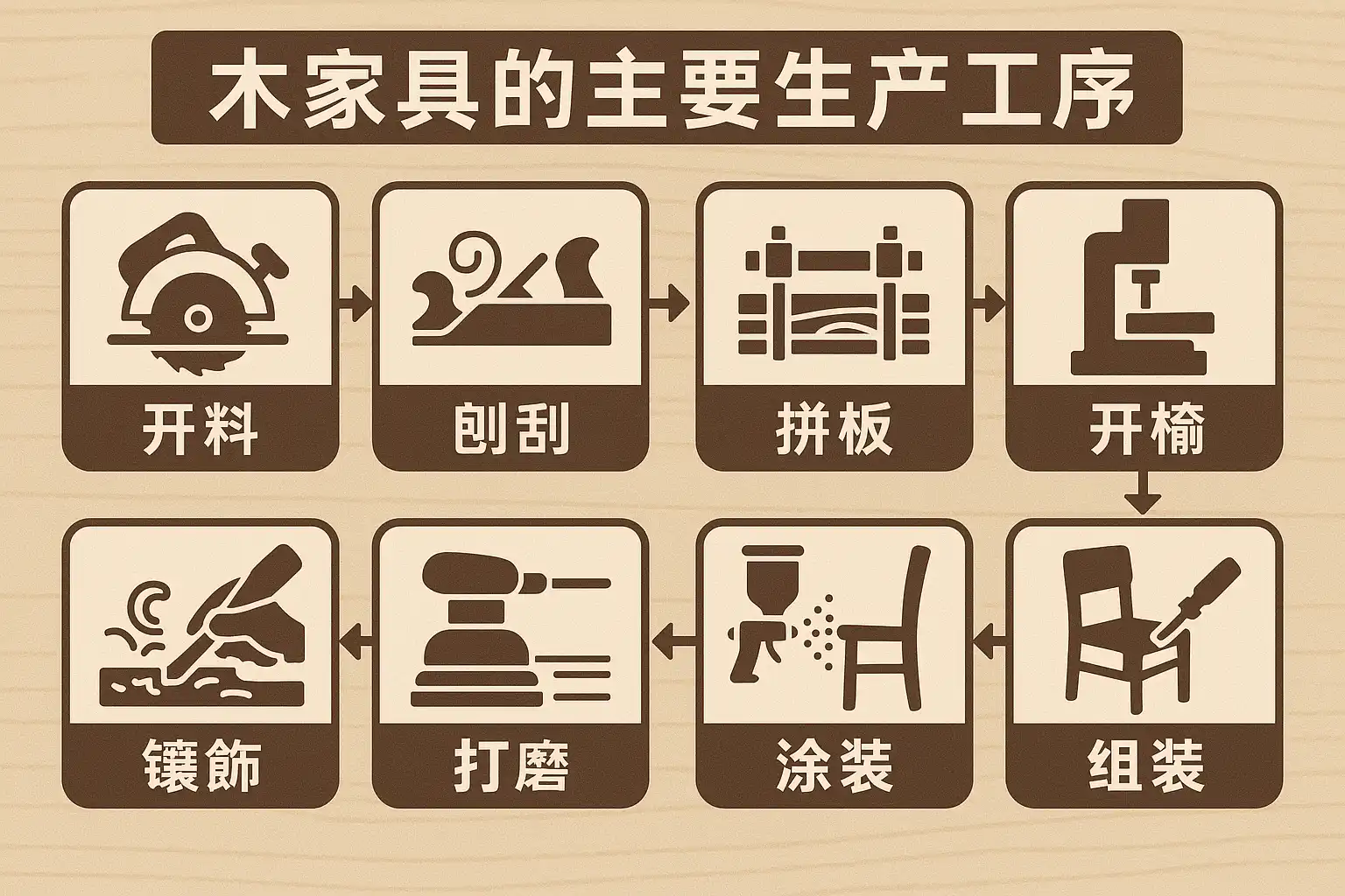 作为一个对木家具制造流程感兴趣的新手,我想了解木家具生产工序的主要步骤都包括哪些?这些环节如何协同保证成品的质量和效率?