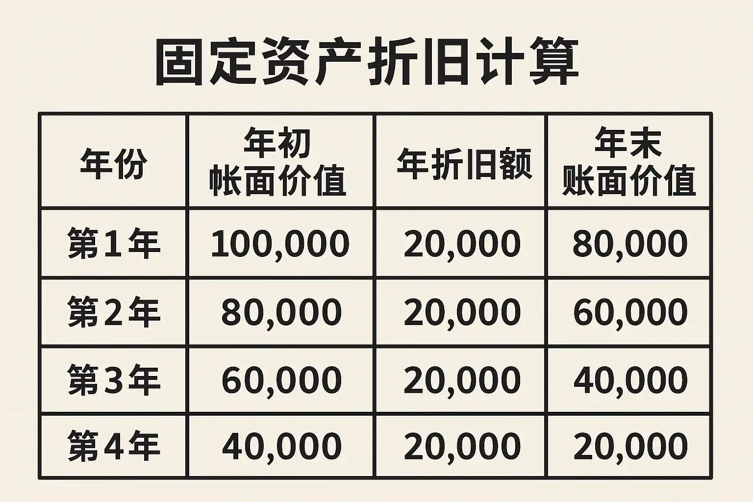 | 直线法 | (原值 - 残值) / 使用年限 | 通用,资产稳定 | 简单、易理解 |