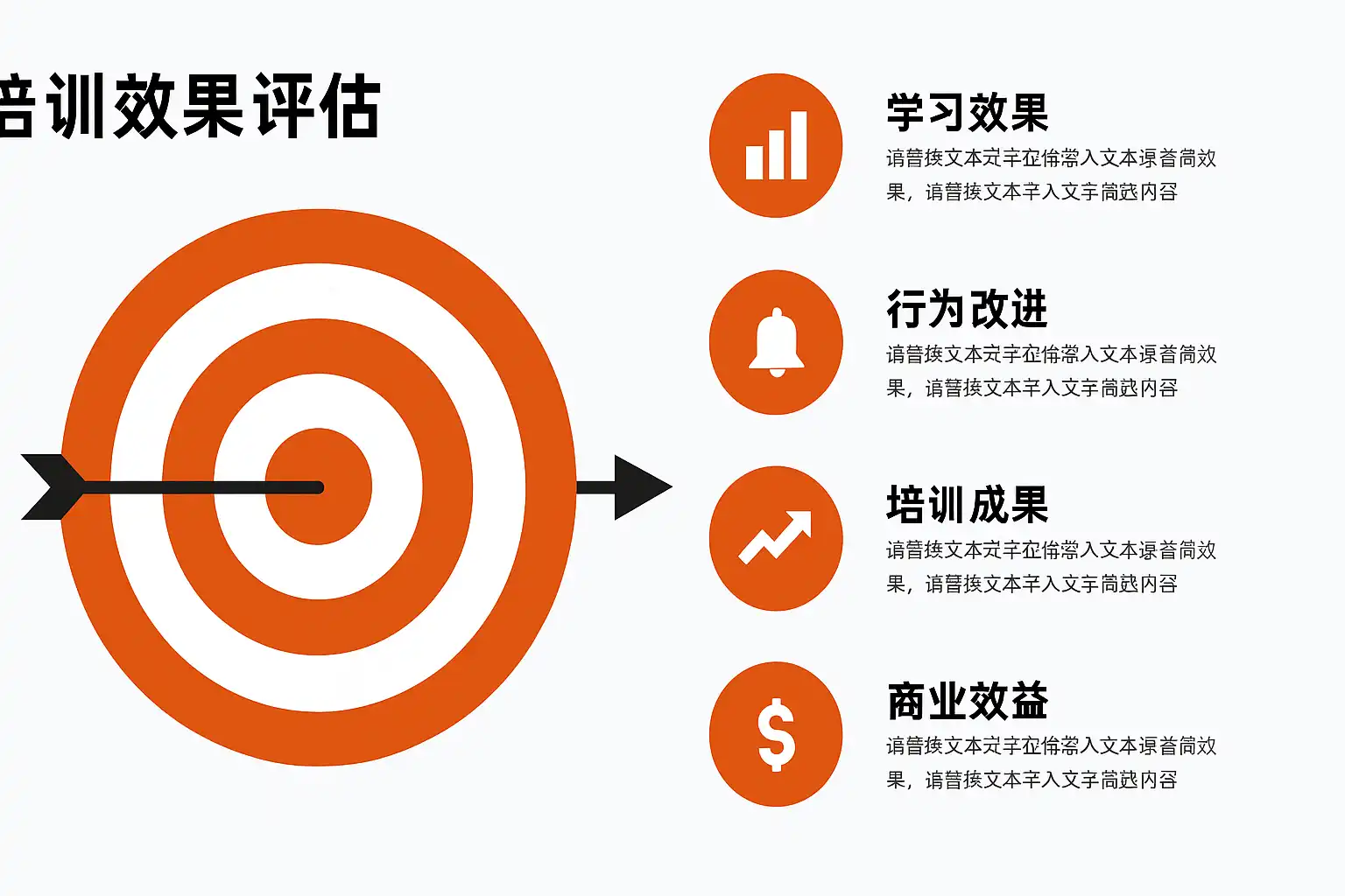 - 结果层评价(绩效指标分析)—通过关键绩效指标(KPI)对比培训前后的变化,如生产效率提升20%。 例如,一家制造企业通过学习层和行为层评价,发现员工操作技能提升15%,生产事故减少10%,从而证实培训效果。